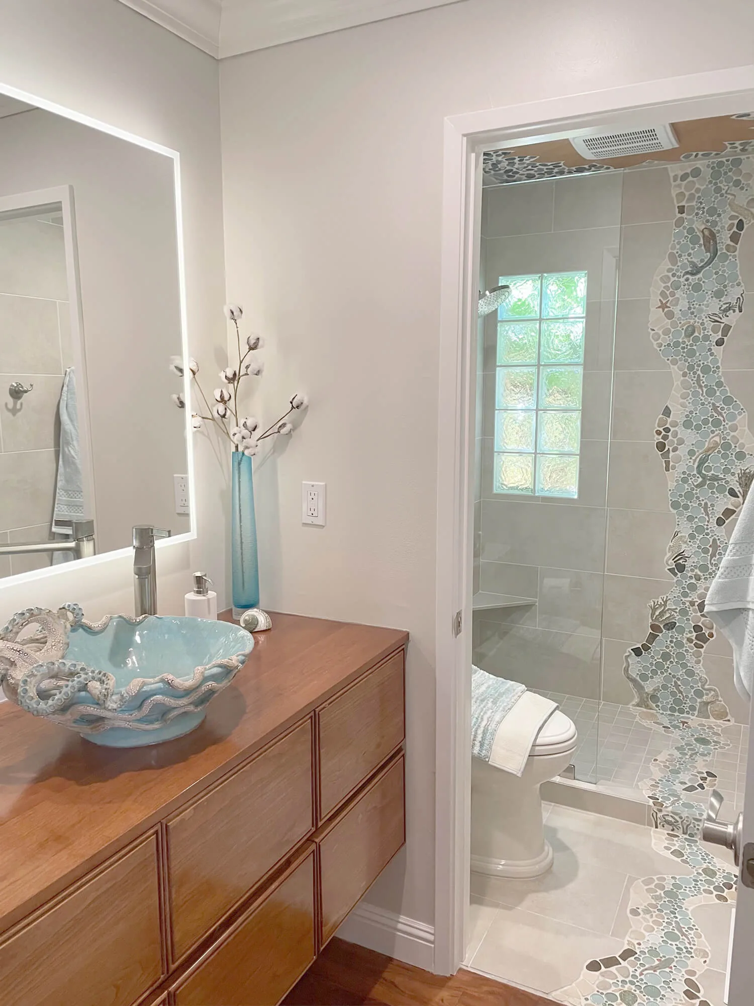 For those seeking an unparalleled bathing experience, a steam room offers a serene escape. And let’s not forget the finishing touch: a vanity mosaic tile backsplash with one of our custom tile borders that adds a touch of glamour and personality.