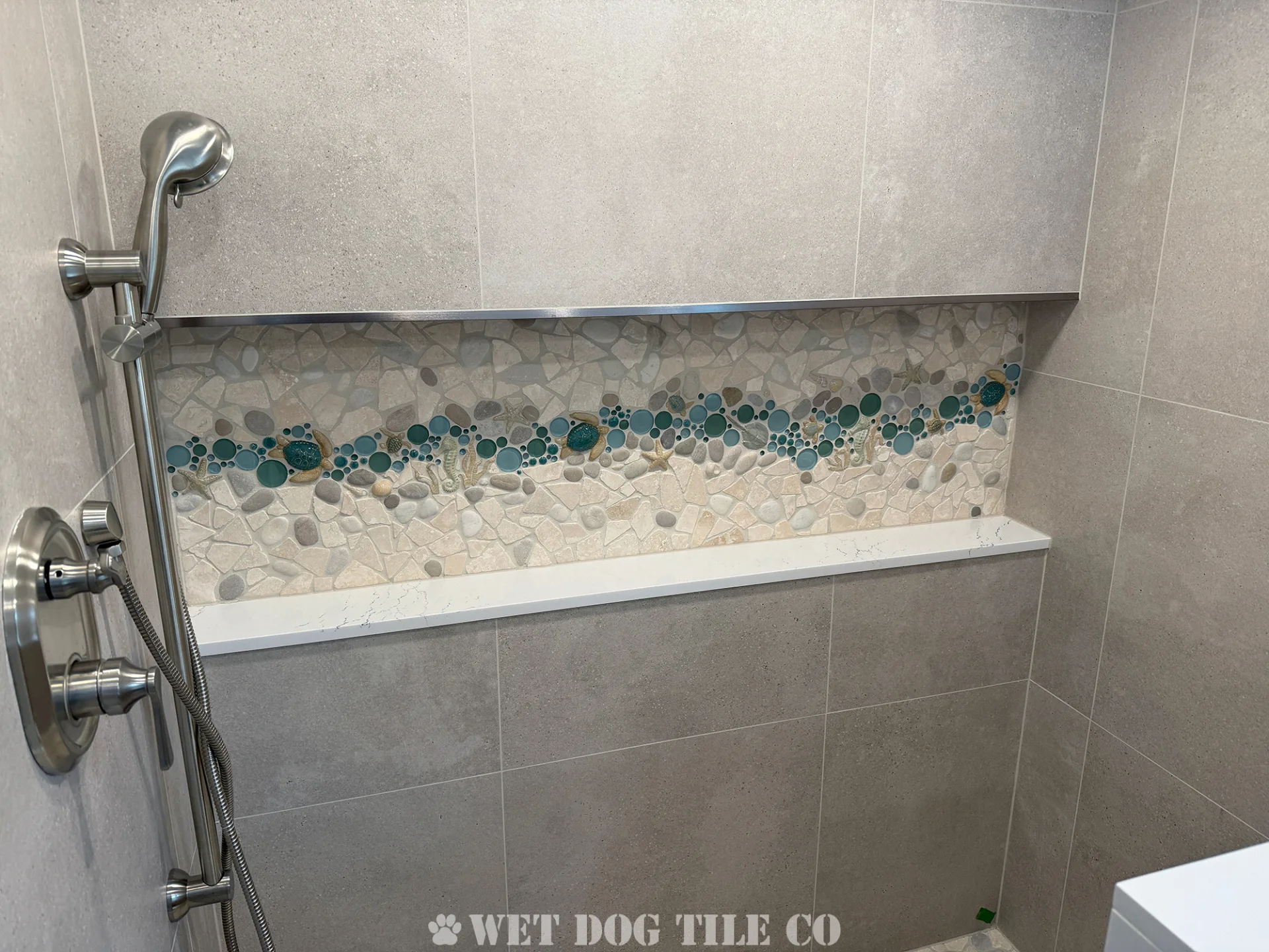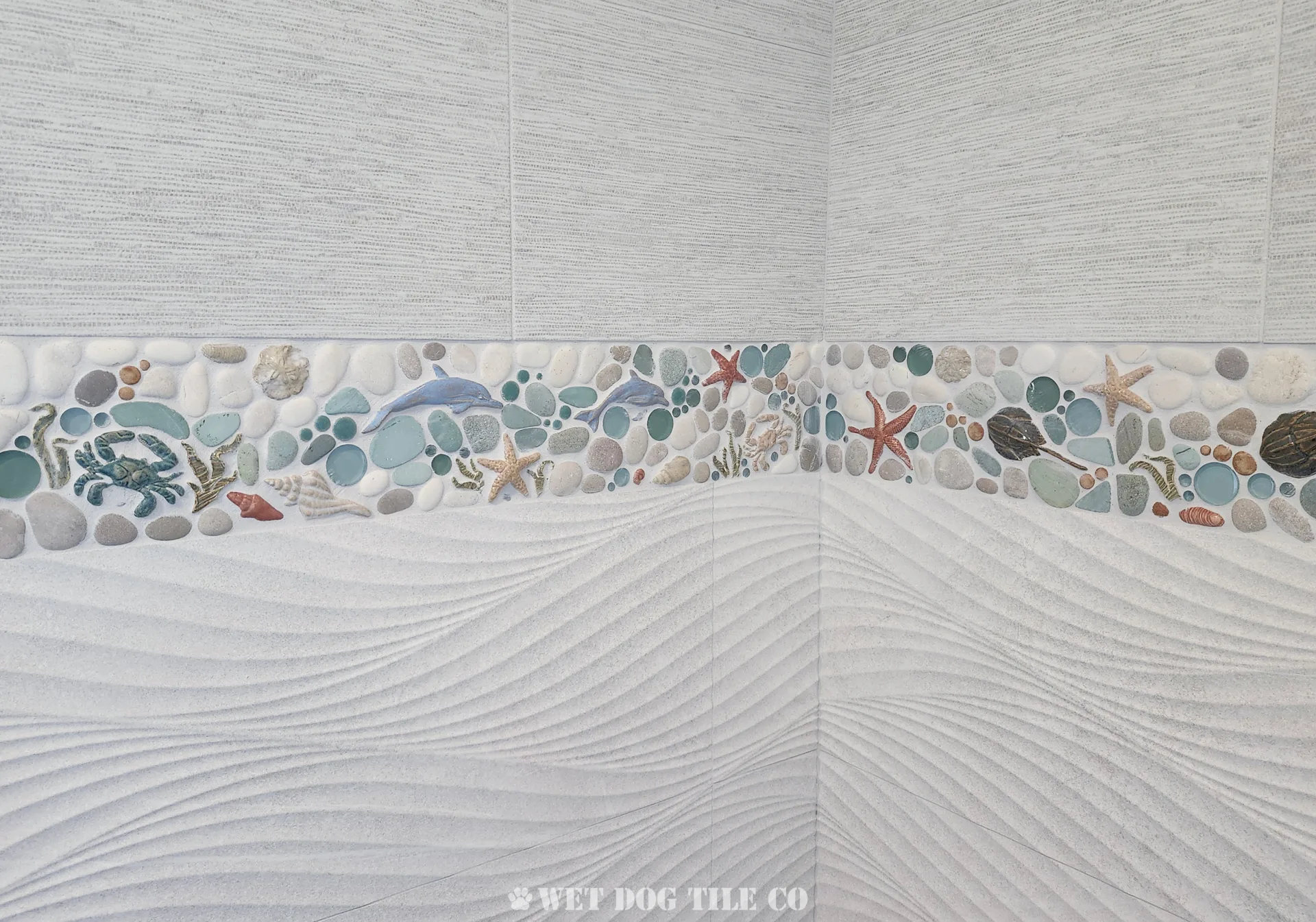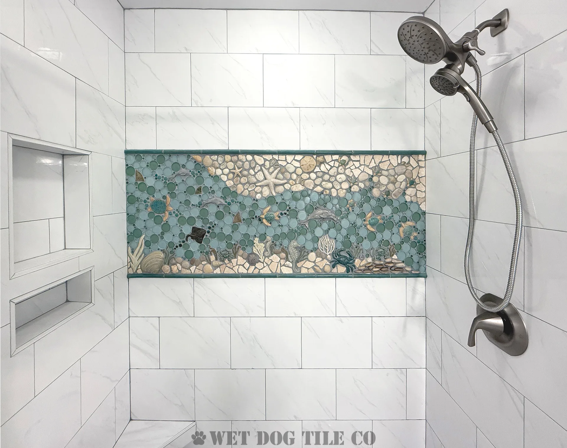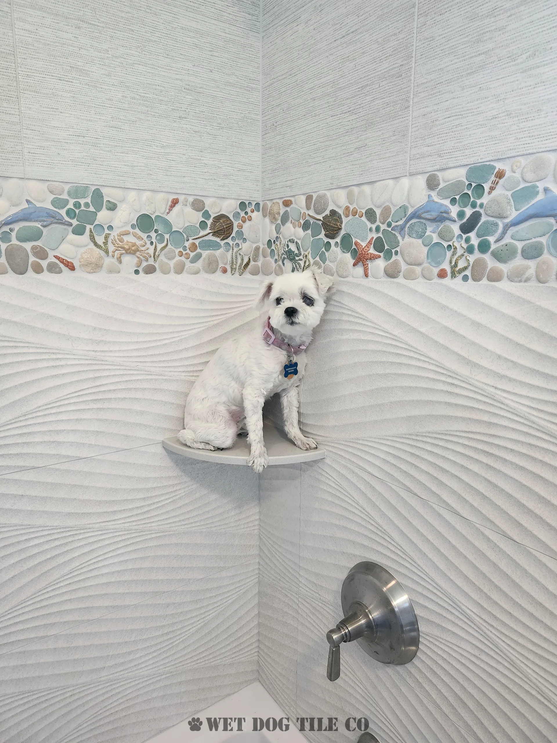 A: Mosaic tile offers greater design flexibility, allowing for intricate patterns and a wide variety of colors and textures that can make your bathroom stand out. Their smaller size and customization options enable more creative and personalized designs than ordinary tiles. Whether you’re doing a mosaic tile niche, backsplash border, or a complete mosaic tile shower, Wet Dog Tile has you covered!