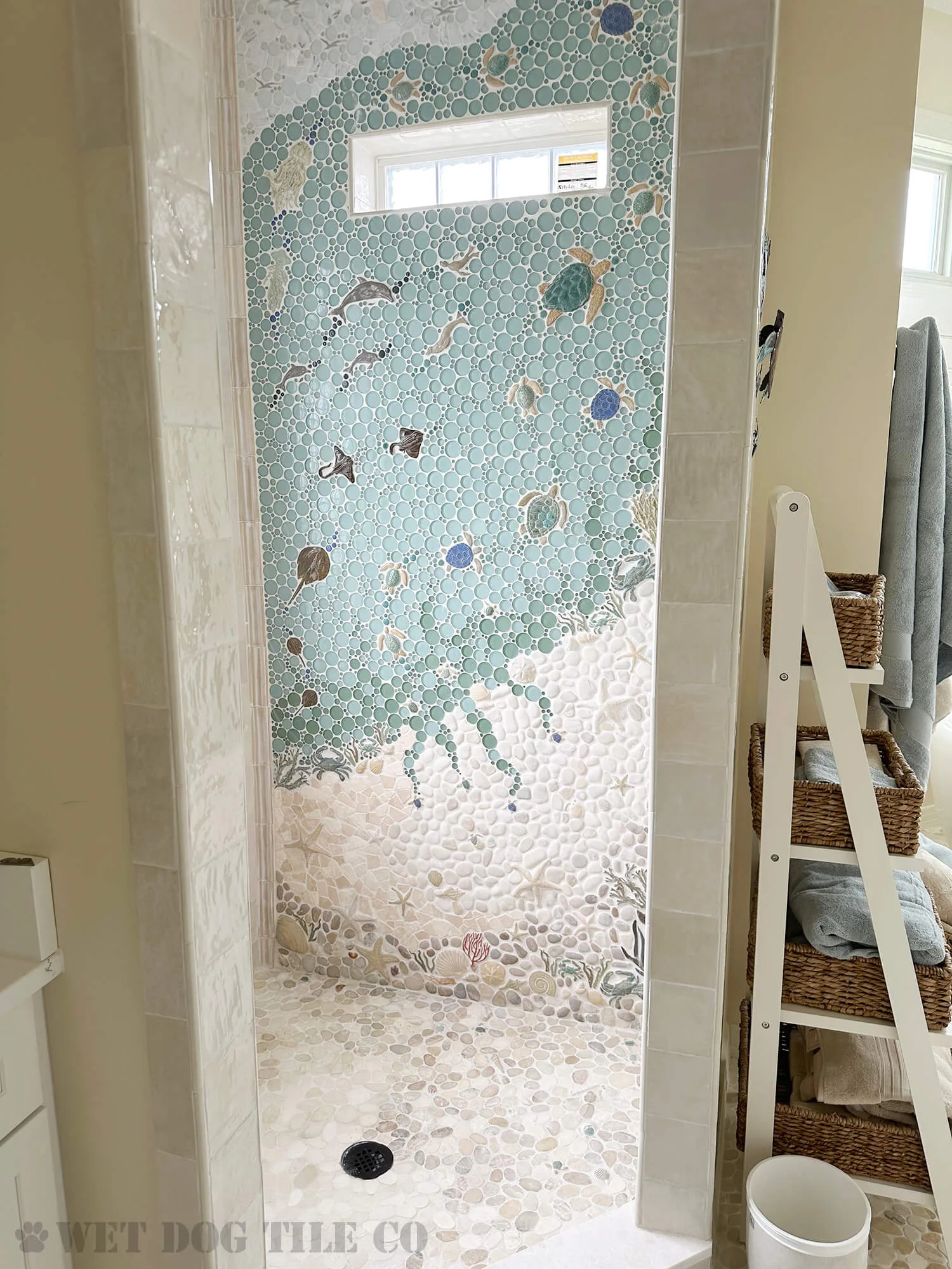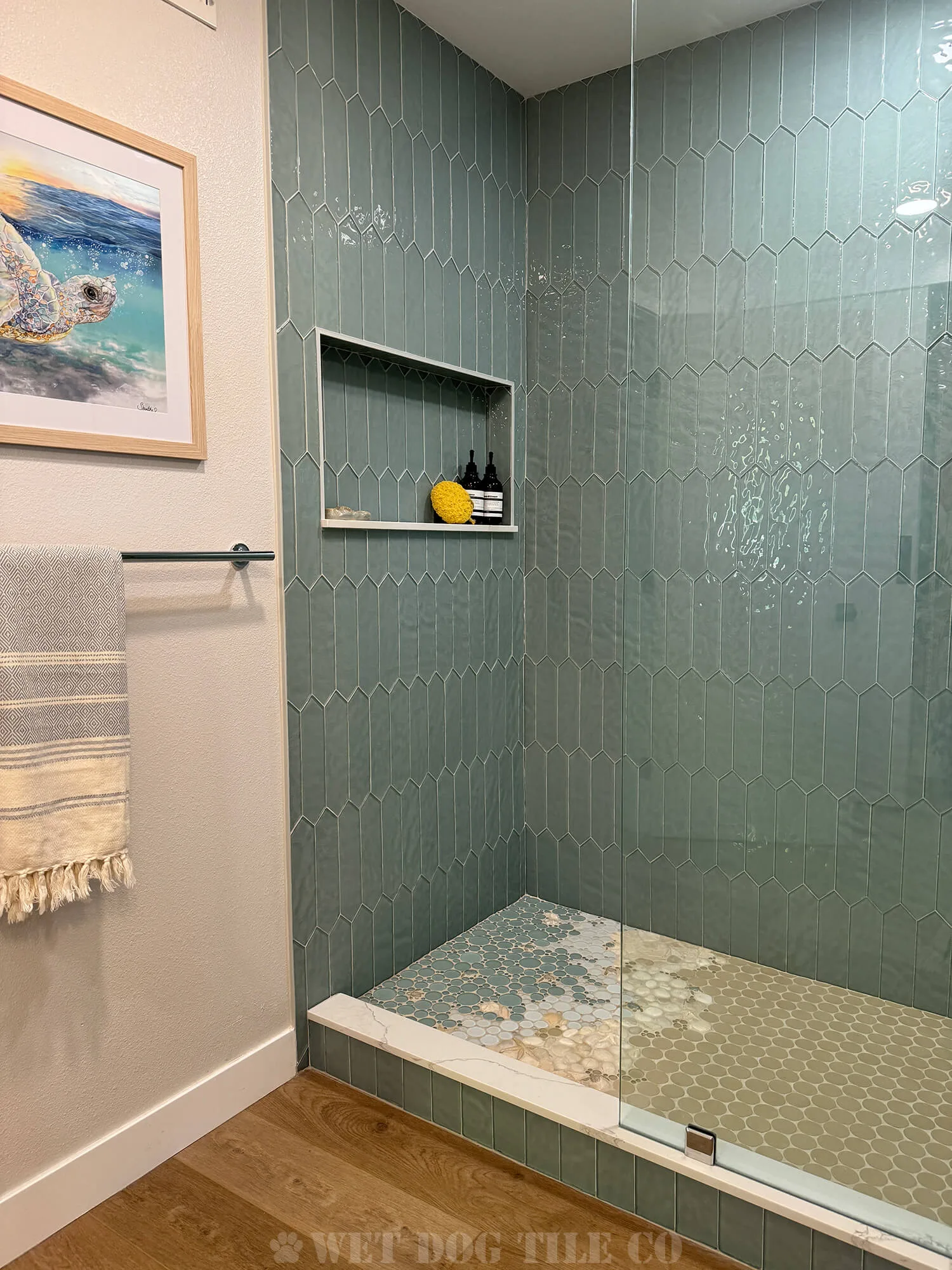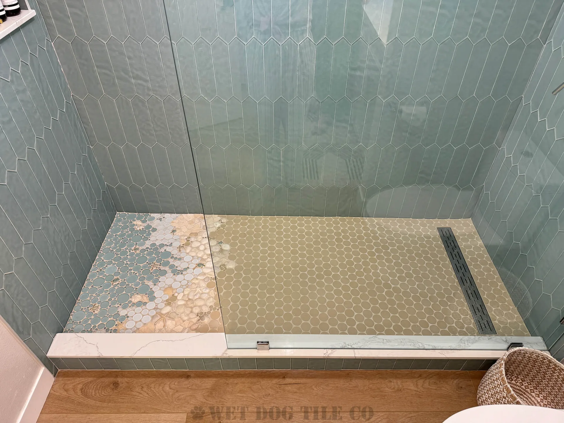 A: Mosaic tile offers greater design flexibility, allowing for intricate patterns and a wide variety of colors and textures that can make your bathroom stand out. Their smaller size and customization options enable more creative and personalized designs than ordinary tiles. Whether you’re doing a mosaic tile niche, backsplash border, or a complete mosaic tile shower, Wet Dog Tile has you covered!