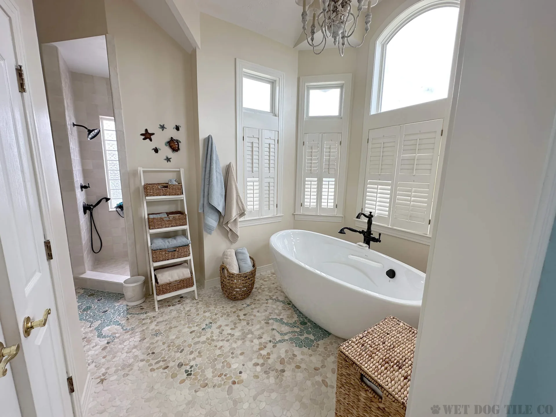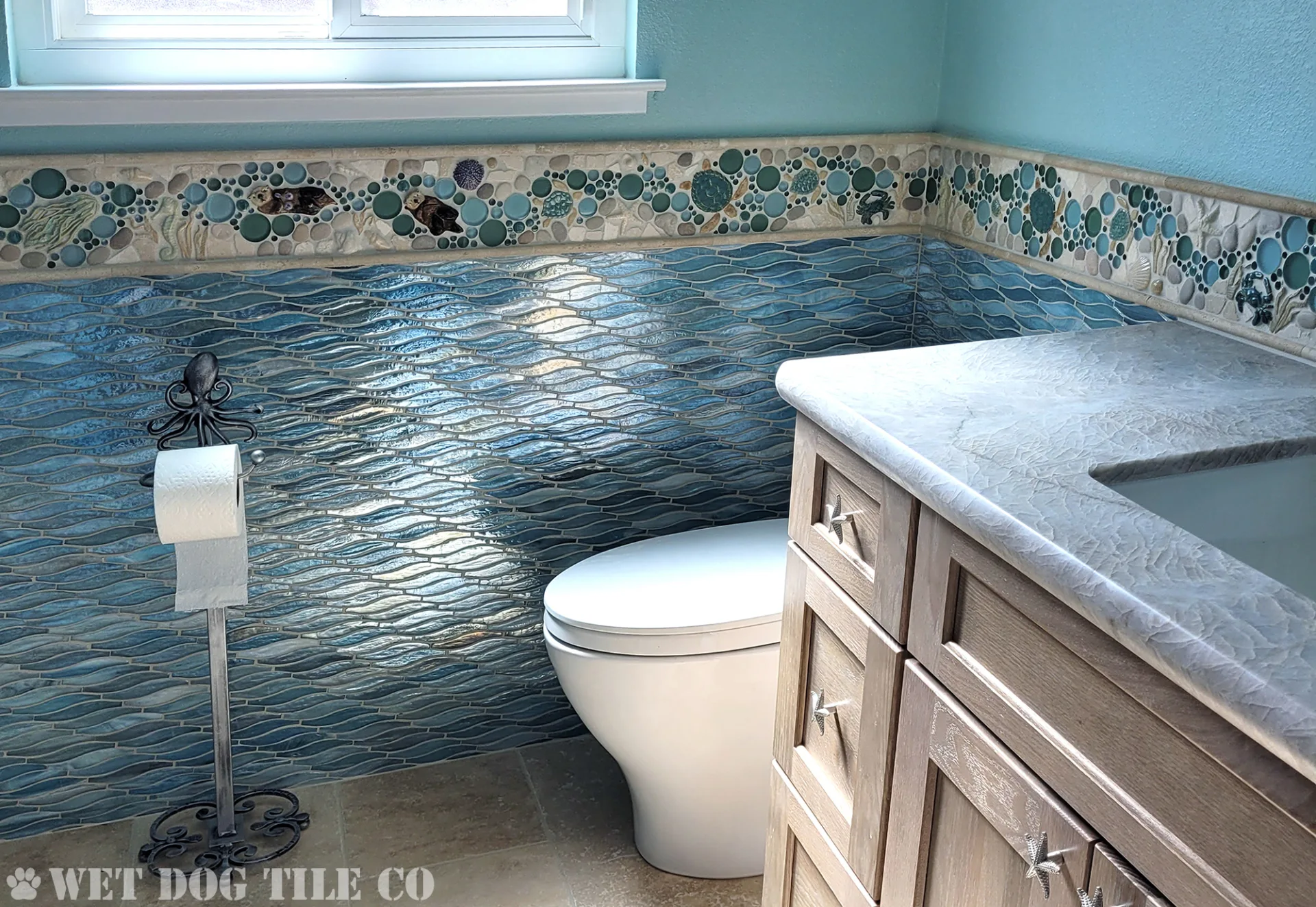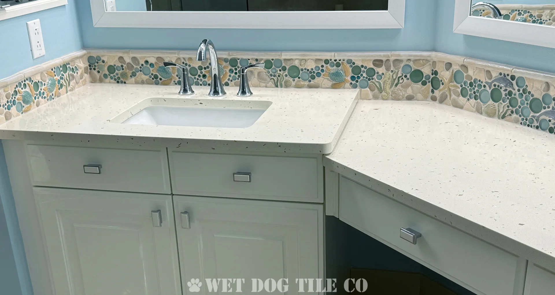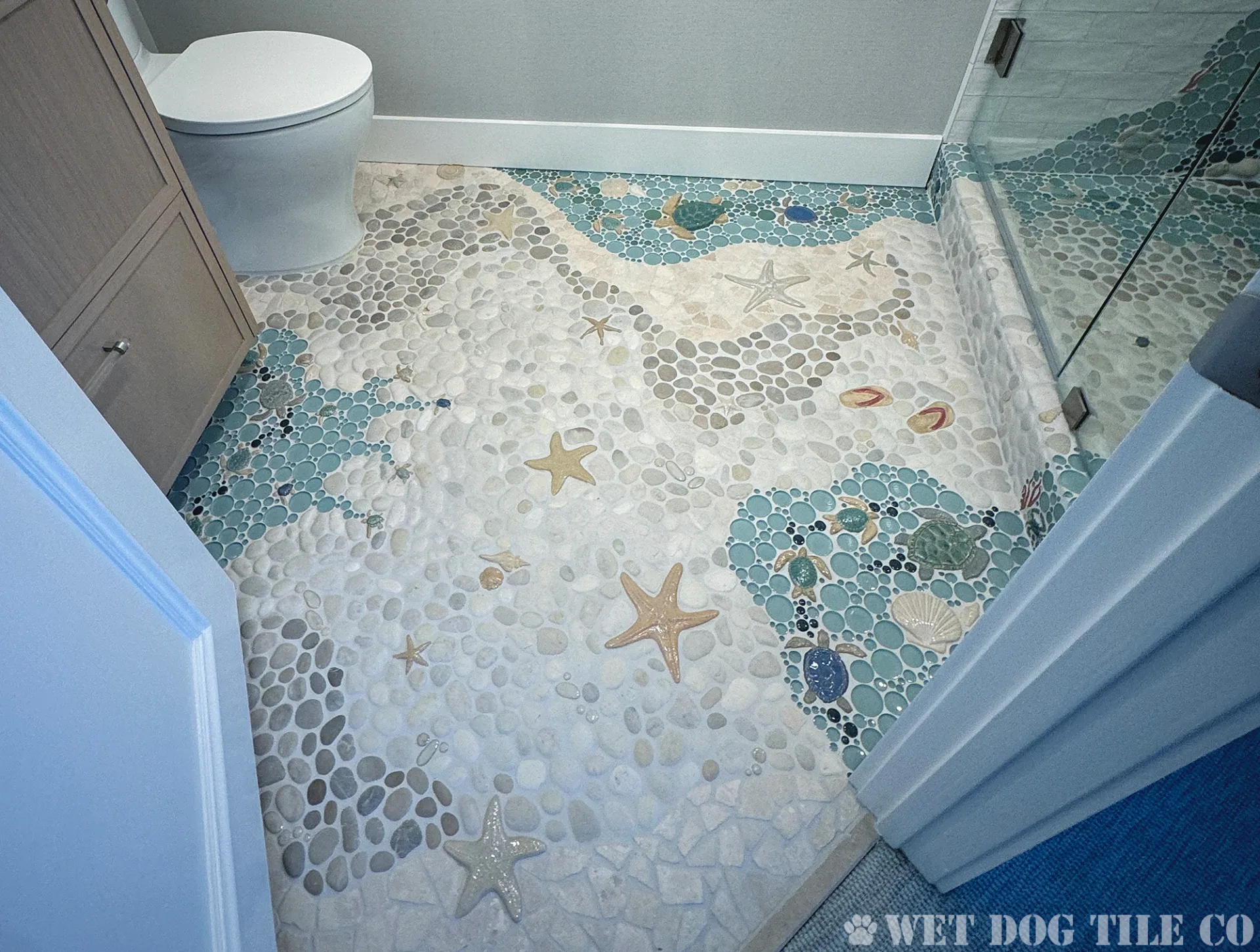 A: Mosaic tile offers greater design flexibility, allowing for intricate patterns and a wide variety of colors and textures that can make your bathroom stand out. Their smaller size and customization options enable more creative and personalized designs than ordinary tiles. Whether you’re doing a mosaic tile niche, backsplash border, or a complete mosaic tile shower, Wet Dog Tile has you covered!