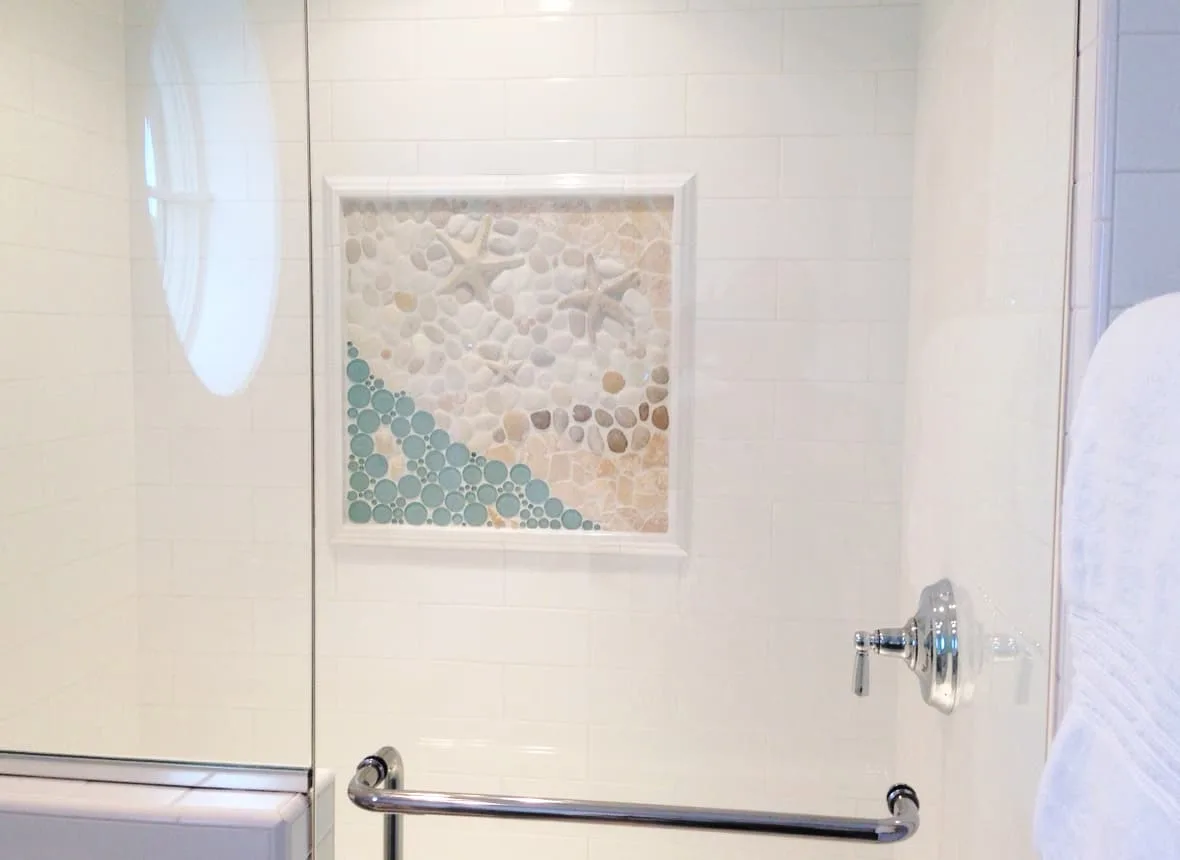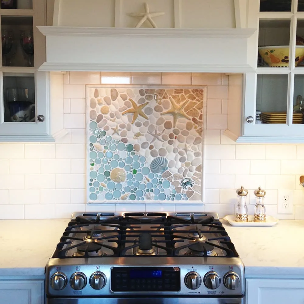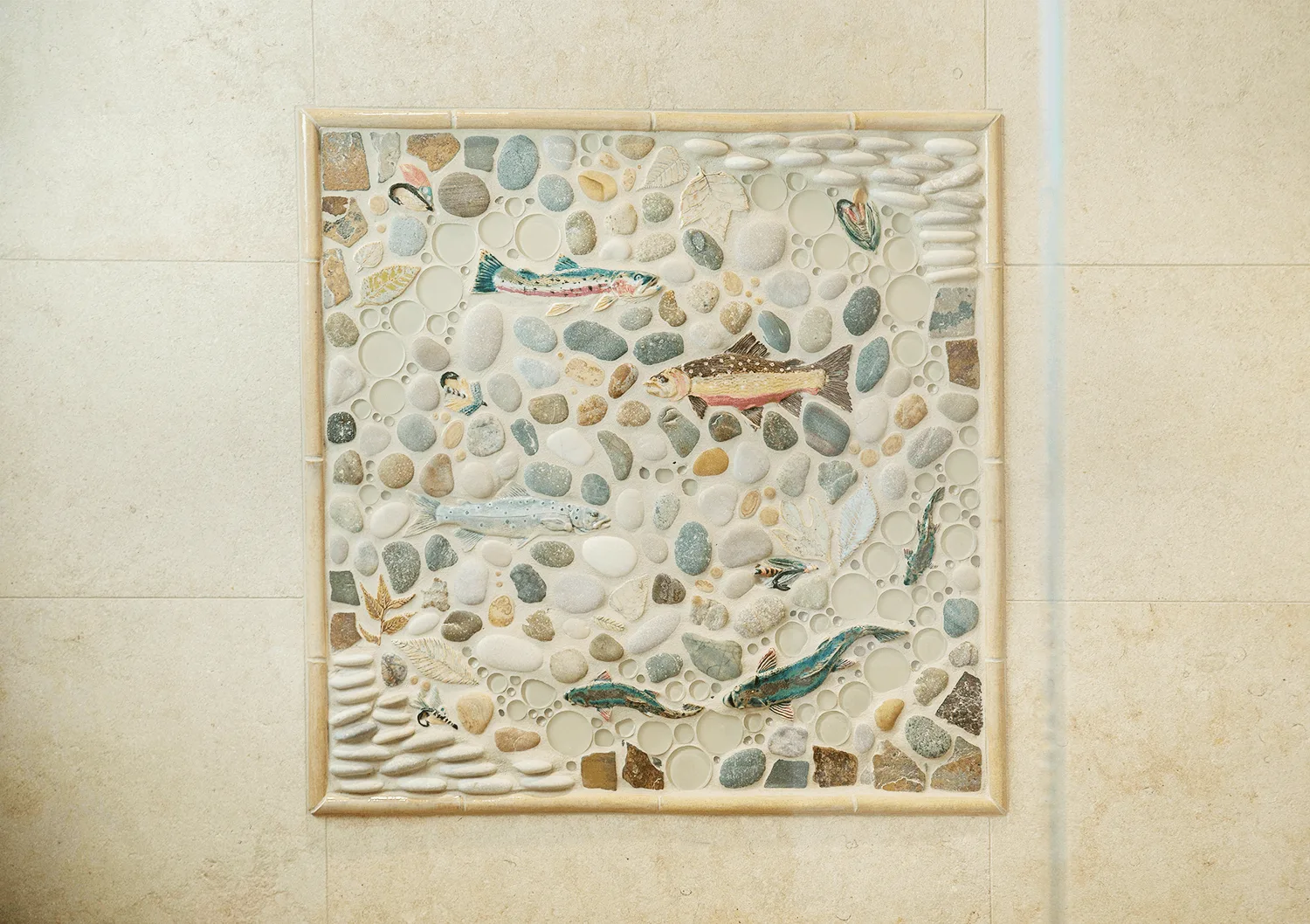 The versatile square mural layout is ideally suited for kitchen tile backsplashes seamlessly integrating with cooktop and hood vent proportions, or above a sink to evoke the elegance of framed art. These also feel right at home in a mosaic shower wall installation, either as a feature panel or inside a recessed niche.
