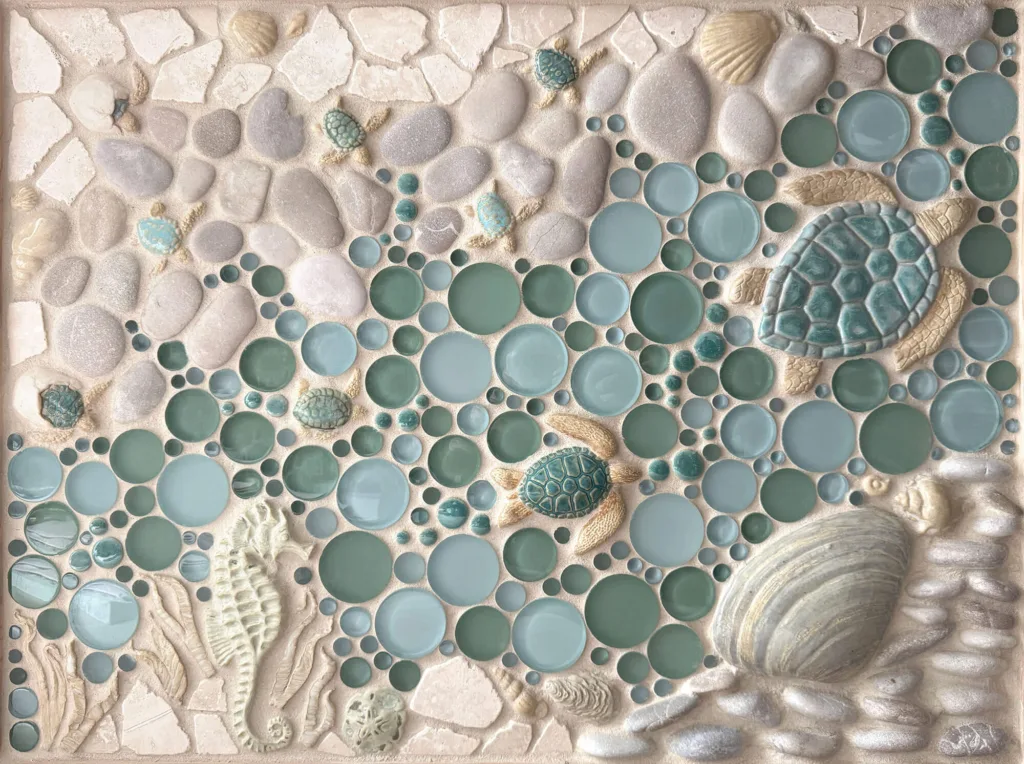 Capturing the beauty and whimsy of turtle hatchlings making their journey to the sea! Glazed in striking shades of teal, blue, and green, and paired with stones in neutral, sandy shades, this pieces is both colorful and interesting but neutral enough to fit any aesthetic. Subtle details like a seahorse lurking in the kelp, shells in varying sizes, and an adult turtle swimming, this piece is easily customizable and can fit any space! Make sure to check out the matching border and accompanying shower floor corner design!
