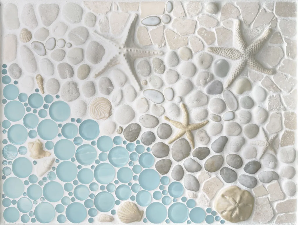 A simple but classic nod to the love of the shore. Our signature starfish, sand dollar, and shell tiles glazed in soft neutrals, paired with our blue raindrop glass and a variety of pebbles and stone, create a timeless and elegant look. Easily customizable to create a striking focal piece for any space. Capture the calming vibe of the beach in your home! Make sure you check out the matching border in the “Tidal” colorway, like our “Tidal – Ocean Medley” border!