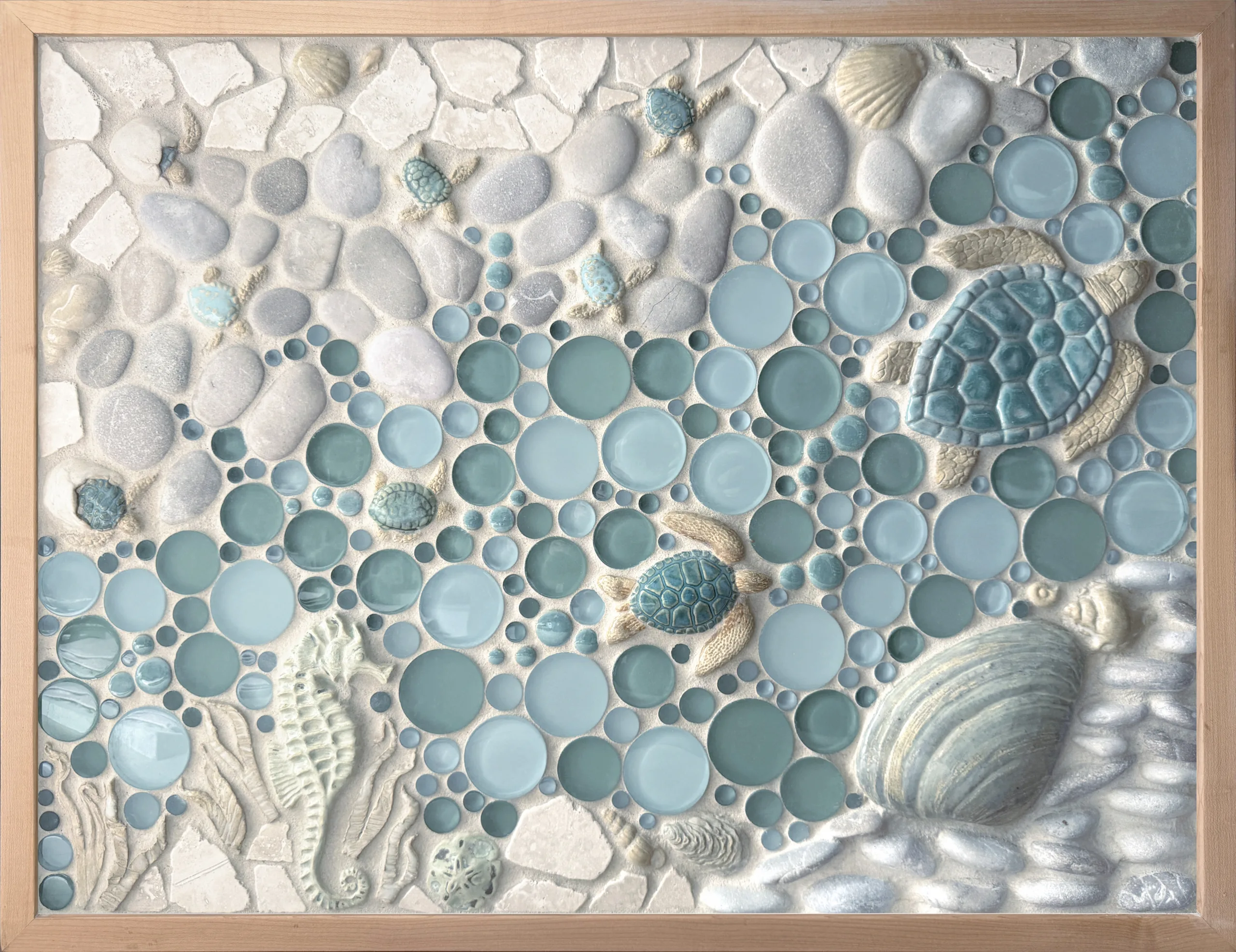 Capturing the beauty and whimsy of turtle hatchlings making their journey to the sea! Glazed in striking shades of teal, blue, and green, and paired with stones in neutral, sandy shades, this pieces is both colorful and interesting but neutral enough to fit any aesthetic. Subtle details like a seahorse lurking in the kelp, shells in varying sizes, and an adult turtle swimming, this piece is easily customizable and can fit any space! Framed in your choice of hand-painted and distressed white pine or natural maple and grouted with Laticrete Permacolor #39 Mushroom.