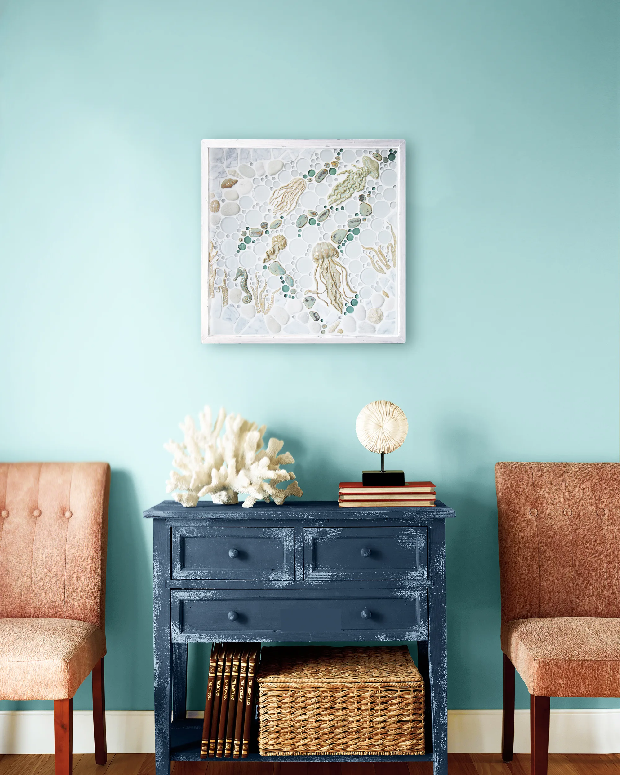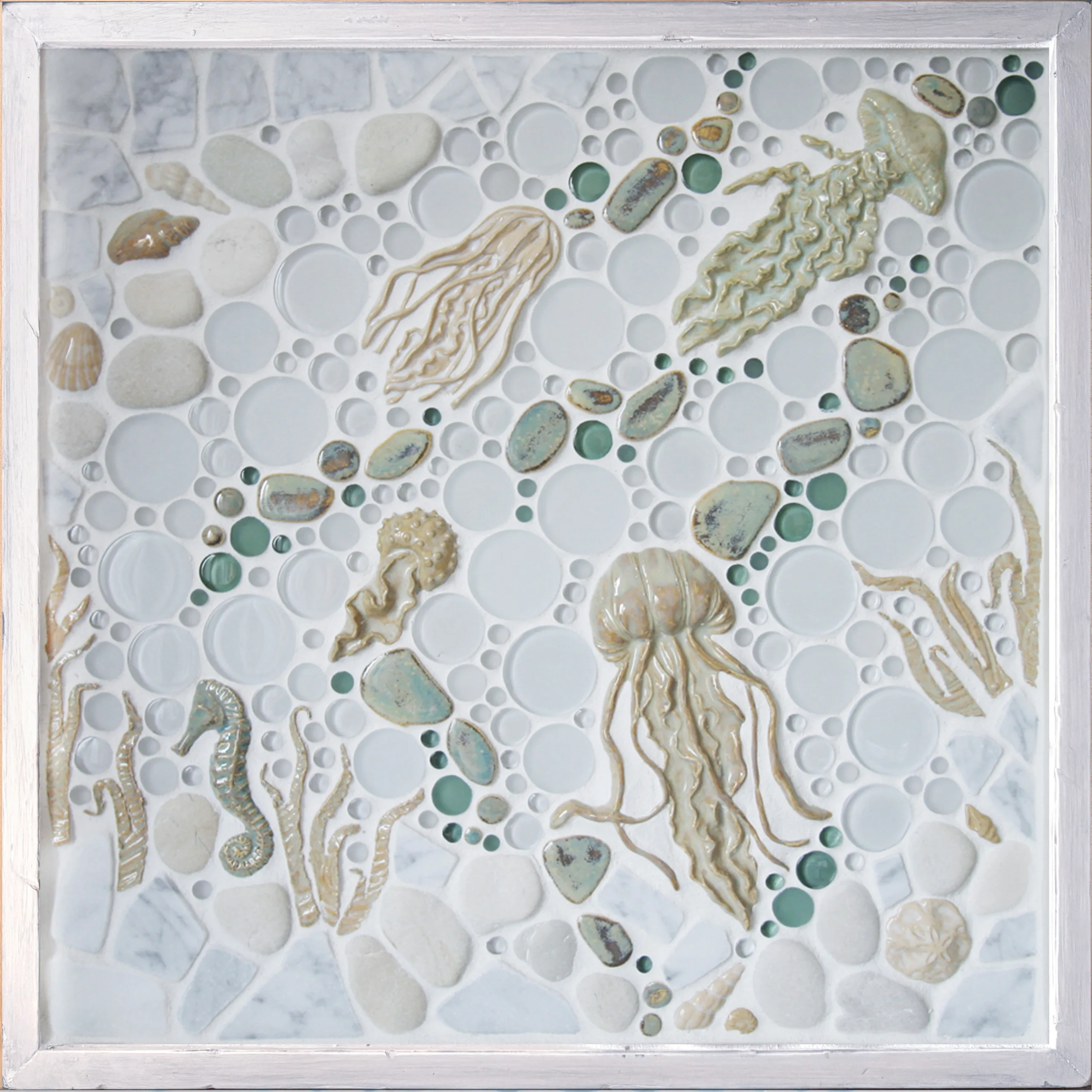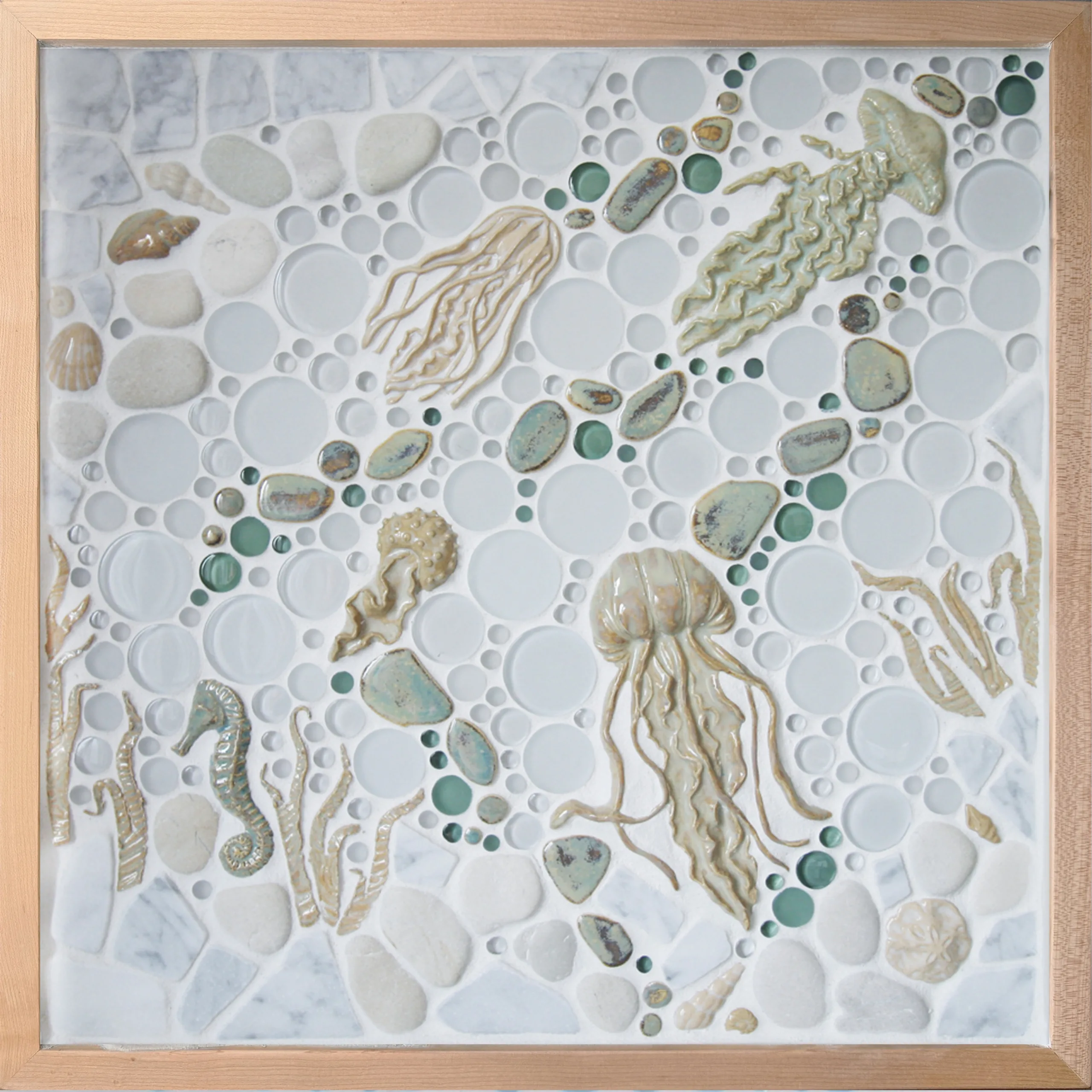 Our tribute to the mystical creatures of the ocean; Jellyfish! This piece is a playful but elegant look, perfect for kitchens, bathrooms, pool houses, or any place you’d like a pop of eclectic, ocean charm! A subtle but colorful assortment of soft grays, greens, creams, and whites create a striking composition with a sense of movement. The jellyfish are accented by our Small Seahorse, various kelp, and an assortment of shells. Framed in your choice of hand-painted and distressed white pine or natural maple and grouted with Laticrete Permacolor #44 Bright White.