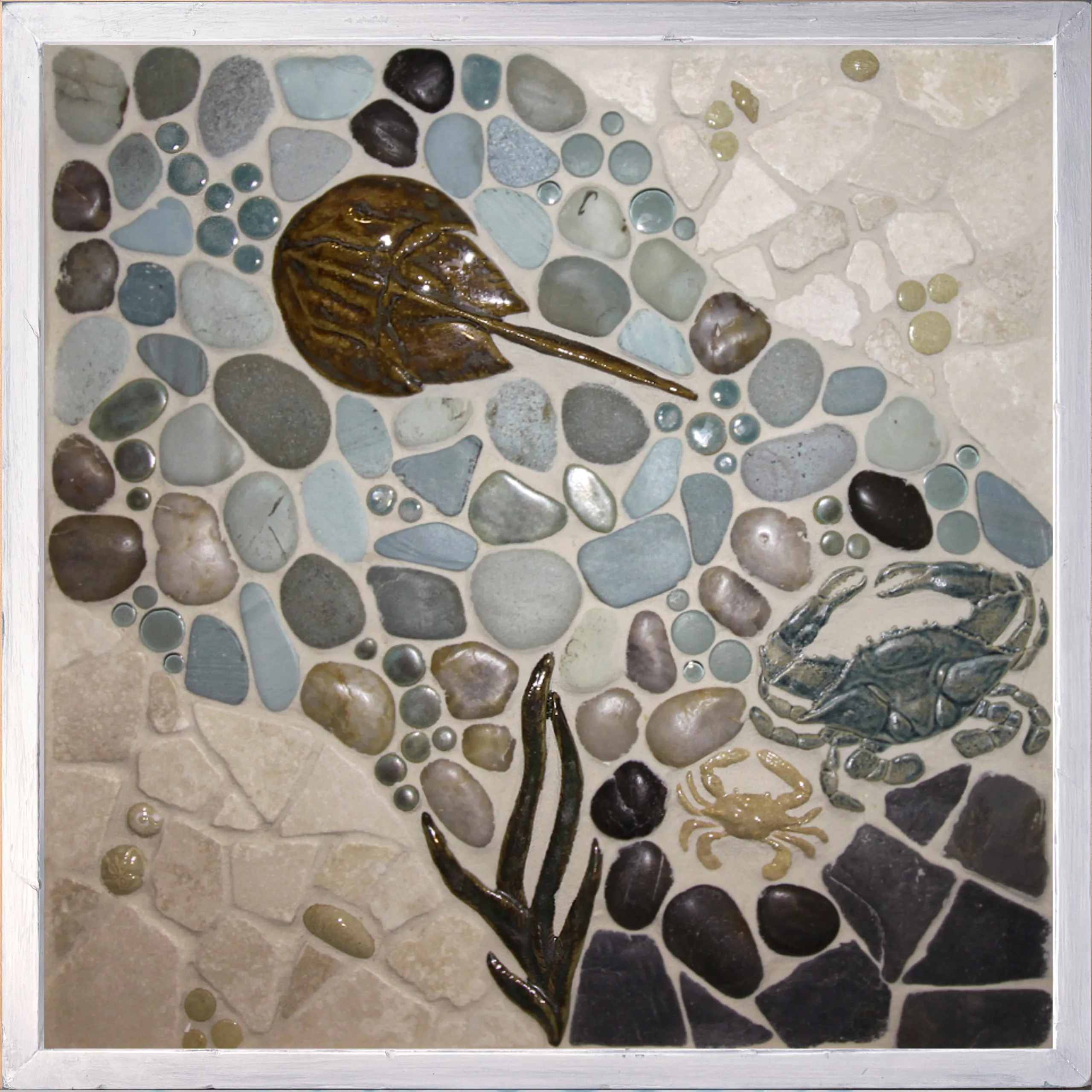A nod to the rocky and rugged shorelines of the New England, the Pacific North West, and of course the creatures that call it home! Neutrals pair with darker grays and soft greens. Glass and our glazed drops create movement and color that accent the crabs perfectly. Eel grass and shells add the finishing touch to this stunning mural. Framed in your choice of hand-painted and distressed white pine or natural maple and grouted with Laticrete Permacolor #39 Mushroom.
