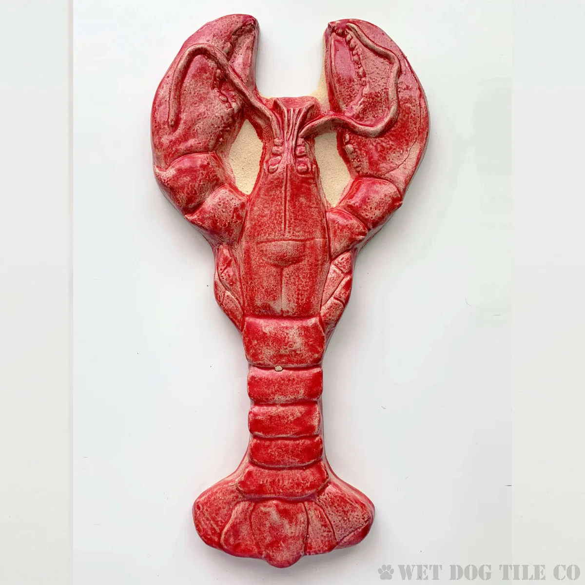 This is our 12″ Lobster from the Ocean Dog Tile Collection. Bring a playful touch of the sea to your nautical-inspired space with our 12″ Lobster tile. Perfect for accenting a beach house kitchen backsplash, a bathroom wall, or even a cozy outdoor patio, this tile adds a splash of personality and seaside charm wherever it’s placed. This lobster has a small imperfection on the center of its tail.