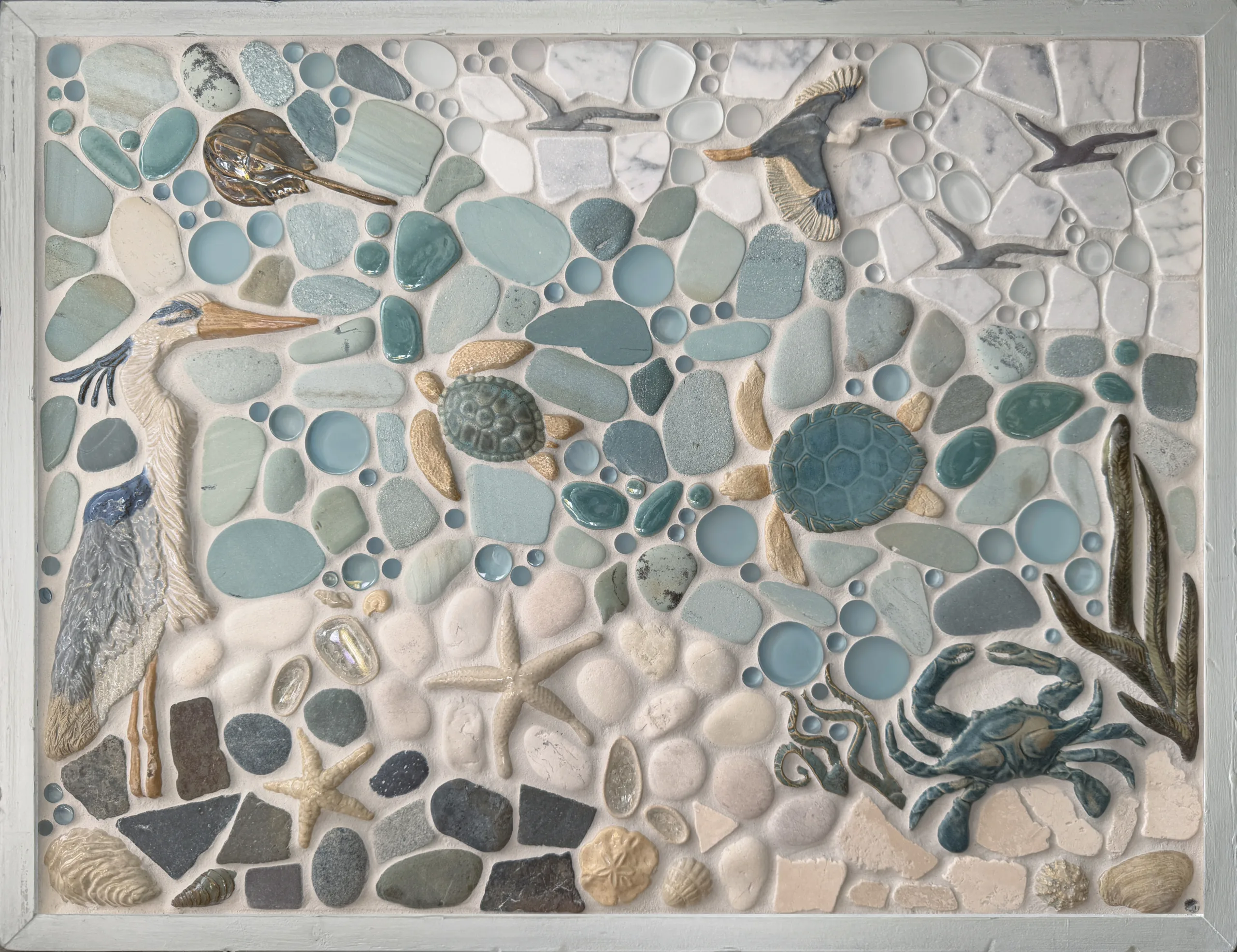 Graceful and commanding, On the Lookout showcases a majestic heron standing tall as it surveys the water’s edge. Surrounding it, turtles bask, starfish and crabs scuttle along the shore, and seagulls soar above, capturing the vibrant life of the coast. Glazed in a serene palette of misty blues, sandy neutrals, and earthy greens, this mural exudes both tranquility and movement. Thoughtfully detailed with scattered shells and subtle textural elements, On the Lookout brings the beauty of coastal wildlife to any space. Framed in your choice of hand-painted and distressed white pine or natural maple and grouted with Laticrete Permacolor #90 Pewter.