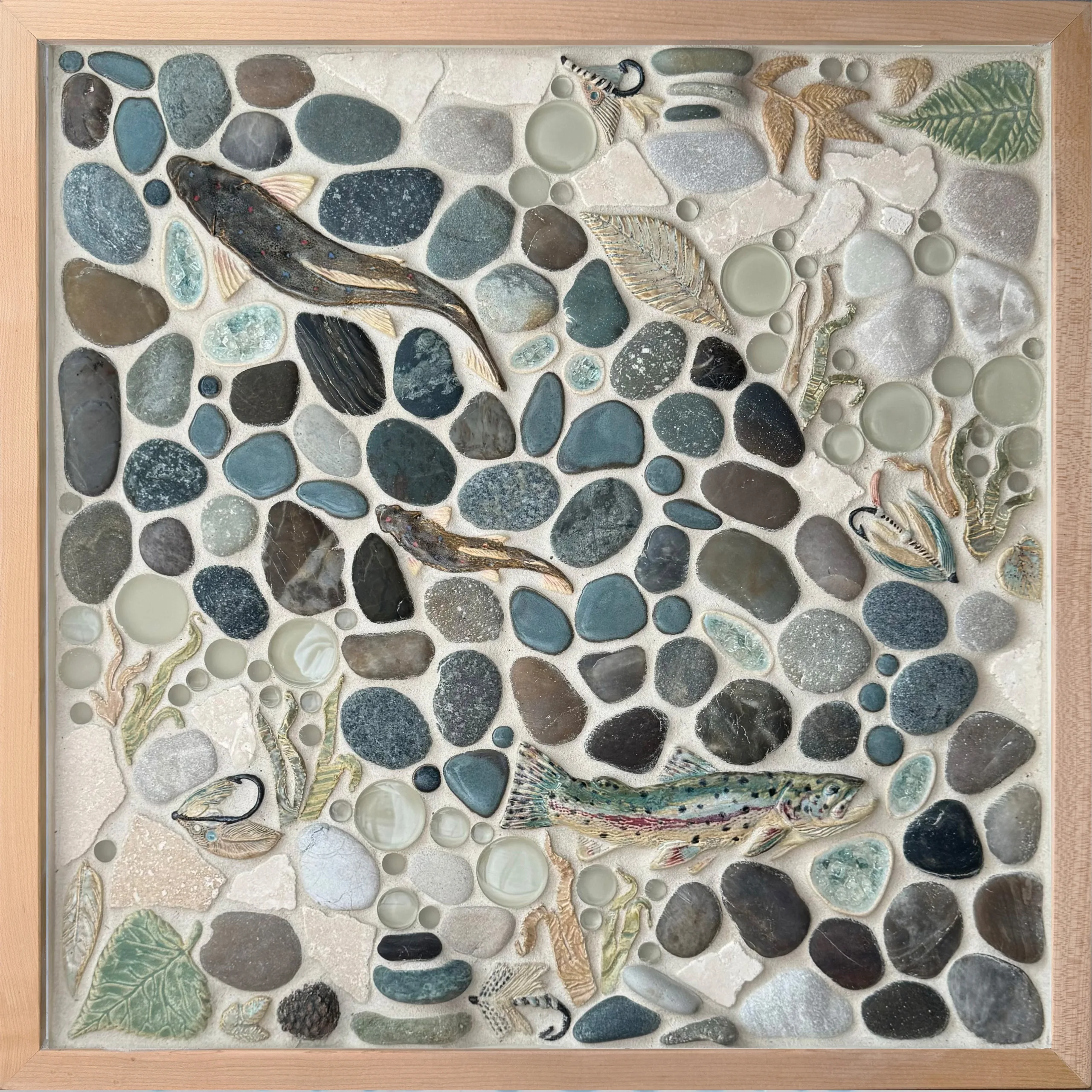 Capturing the spirit of a flowing river and our love for fly-fishing, this hand made mural is inspired by the natural beauty of Colorado and Montana. Features custom handpainted fish, rainbow trout, fishing flies, leaves, and more. This tile design lends itself perfectly to a log cabin, lake house, or anywhere you’d like to turn into a relaxing, tranquil getaway! Will add a conversation piece to your fireplace, mudroom kitchen backsplash, living room, powder room, or any space where you would hang framed artwork. Framed in your choice of hand-painted and distressed white pine or natural maple and grouted with Laticrete Permacolor #39 Mushroom.