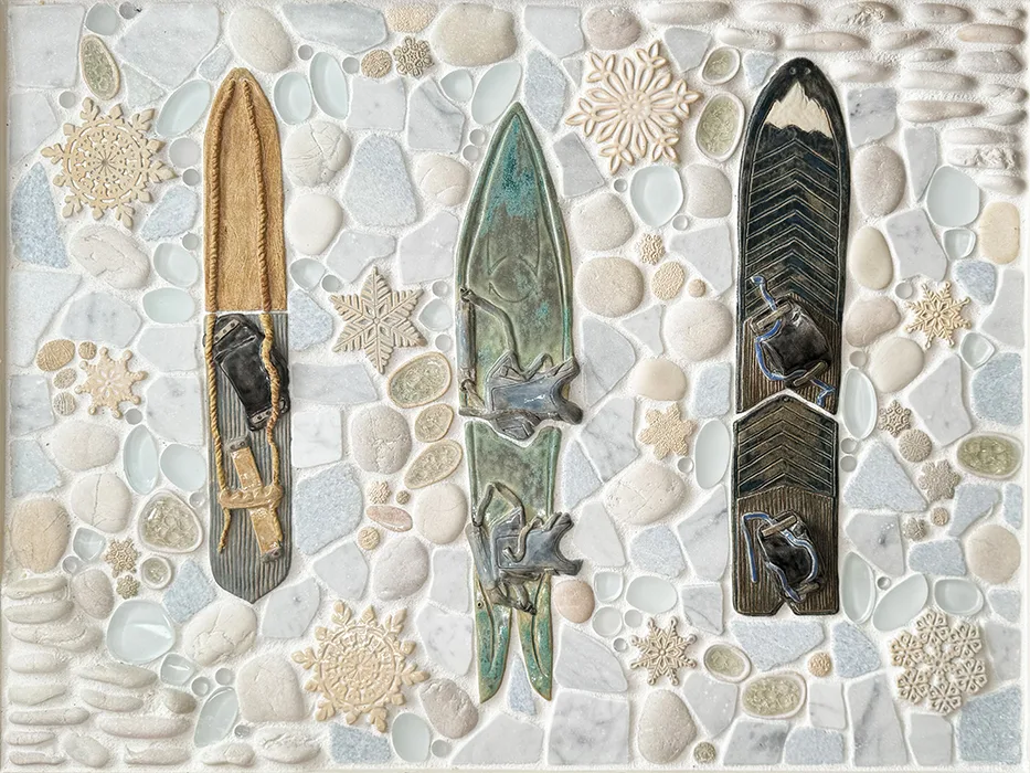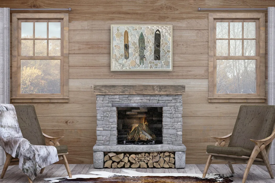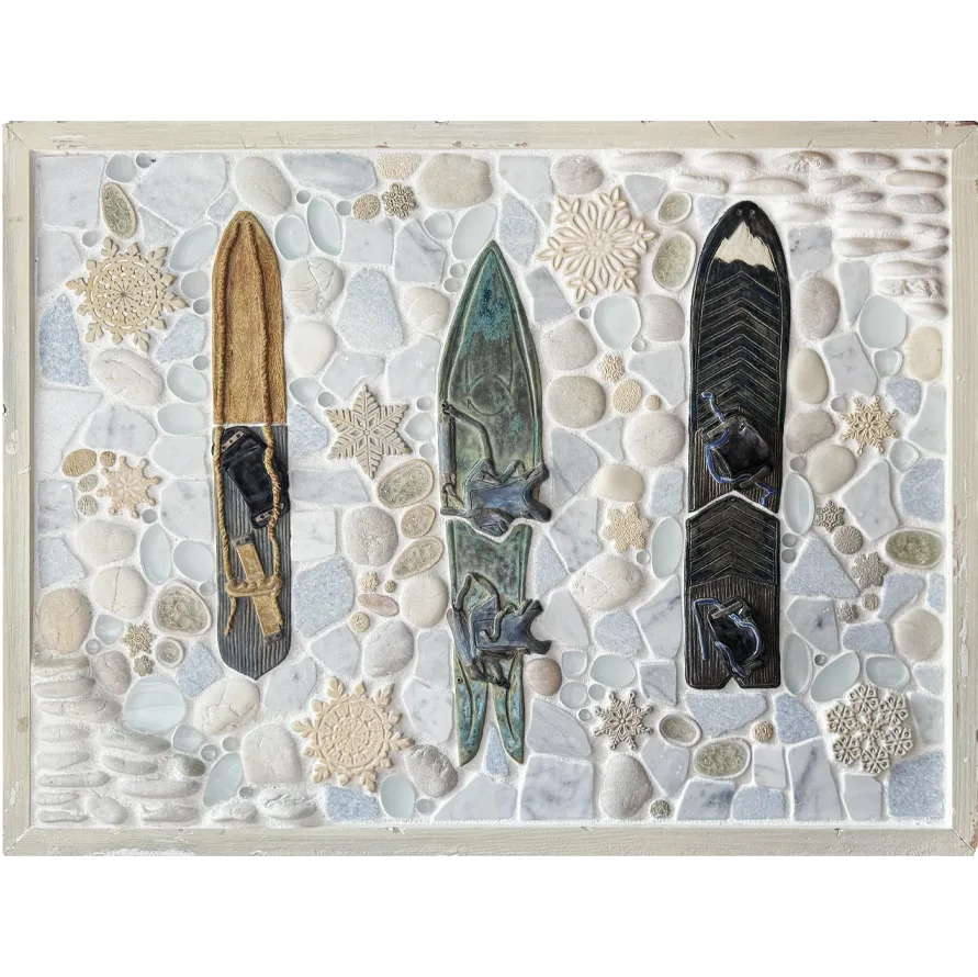 A nod to the origins of snowboarding, and our deep passion for this winter past time. Our handmade vintage snowboard tiles are glazed in a soft but striking color palette. Combined with snowflake tiles, and a variety of glass and natural stone textures. Available in two colorways: Arctic or Snowy. This unique design is perfect for mountain lodges, ski homes and chalets. Will look great above a fireplace, boot room, kitchen backsplash or living room! Framed in hand-painted and distressed white pine and grouted with Laticrete Permacolor #90 Pewter.