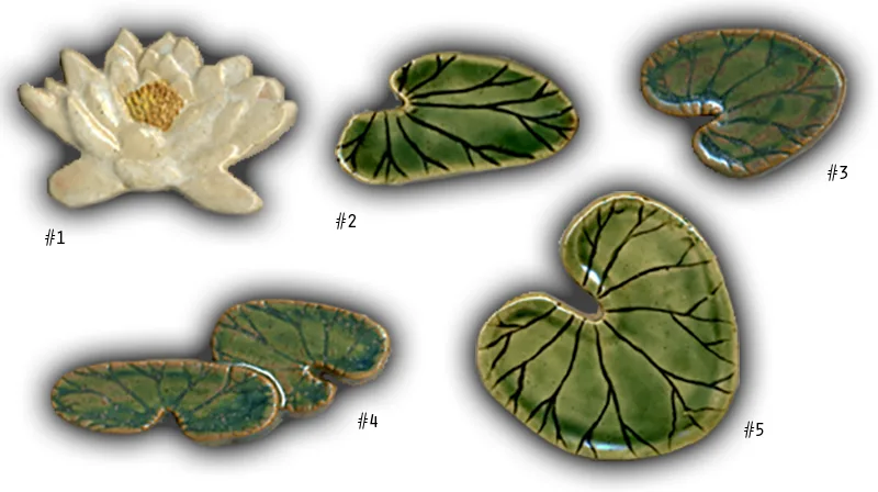 Create a tranquil waterscape in your space with our handmade 2-inch Water Lily & Lily Pad tiles shown and only available for online purchase glazed in “Ice Storm” & “Catfood” (#1), “Clover” (#2 & #5), & “Rin Tin” (#3 & #4). If you’d like our 2″ Water Lily & Lily Pad tiles glazed in a different glaze color please contact us for assistance so we can help you directly. The 2″ Water Lily & Lily Pad tiles is featured in the Lake, Pond, & River Dog Tile Collection. Featuring five distinct profiles, these ceramic tiles beautifully capture the organic shapes and gentle curves of floating lily pads, adding a sense of serenity and natural elegance to any design. Perfect for lake house kitchens, rustic cabin bathrooms, and nature-inspired backsplashes, these tiles bring the peaceful beauty of ponds, wetlands, and slow-moving rivers into your home.